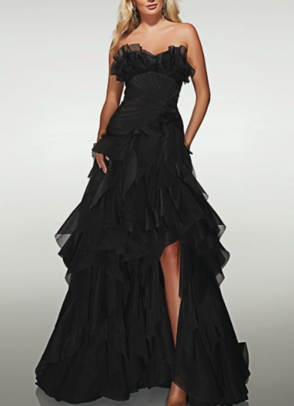 Description: Long crinkle organza A-line gown with ruffle skirt and sweetheart neckline.