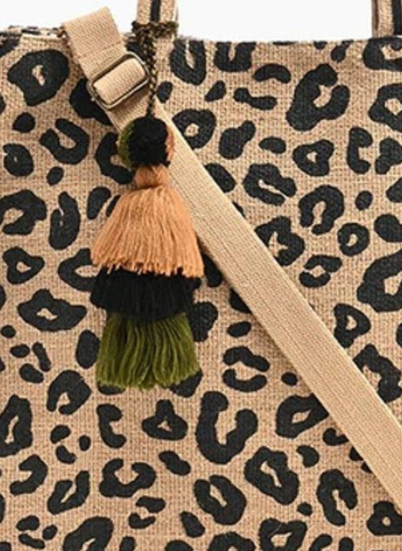 America & Beyond Leopard Jute Tote With Tassel
