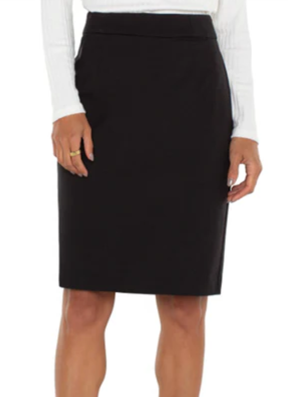 Description: Get that classy, sleek look with this Liverpool pencil skirt. Made of ponte knit, it's designed to hug you nicely while still allowing movement. A back vent also adds to the ease of walking. An invisible back zipper keeps this skirt looking sleek from all angles.