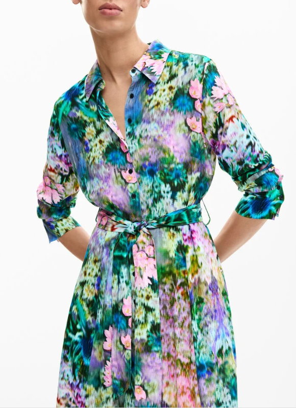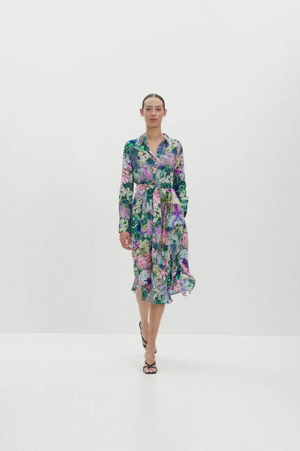 Description: Long dress with long sleeves in flowing floral print fabric with belt in the same tone. Made of Lenzing™ EcoVero™ viscose.