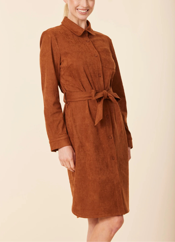 Description: Step into effortless Fall style with this rust faux suede shirt dress, featuring a classic collared neckline, button-front closure, and a matching tie belt for a flattering, adjustable fit. Soft and cozy yet polished, this versatile women’s Fall dress pairs perfectly with boots or layered under jackets, making it an essential piece for your wardrobe.