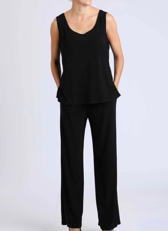 Description: The ensemble features a sleeveless, scoop-neck top with a relaxed fit and a straight hem that extends slightly past the waistline. It is complemented by an overlay detail that adds a layer of sophistication. The matching pants offer a comfortable fit with a smooth front and an elastic waistband. They are cut in a wide-leg style, creating a loose and flowing silhouette. Both pieces are devoid of visible hardware or embellishments, ensuring a seamless and elegant appearance. The fabric’s light to medium weight allows for graceful draping, and the presence of pockets is subtle for a classy look.