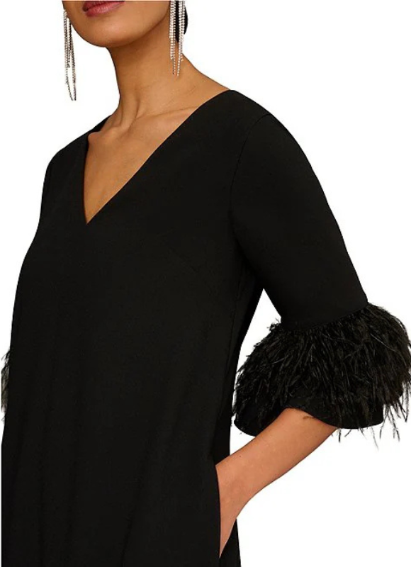 Aidan Mattox by Adrianna Papell V-Neck 3/4 Sleeve Feather Trim Trapeze Dress