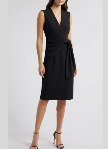Description: An artfully draped bow brings instant drama to a svelte cocktail dress fashioned in an elegant sheath silhouette. Sleeveless, v neck.