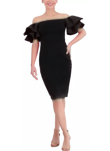 Description: Be a stylish standout in this ruffled off-the-shoulder dress with back zipper closure. Lined, made of scuba material; structured and supportive