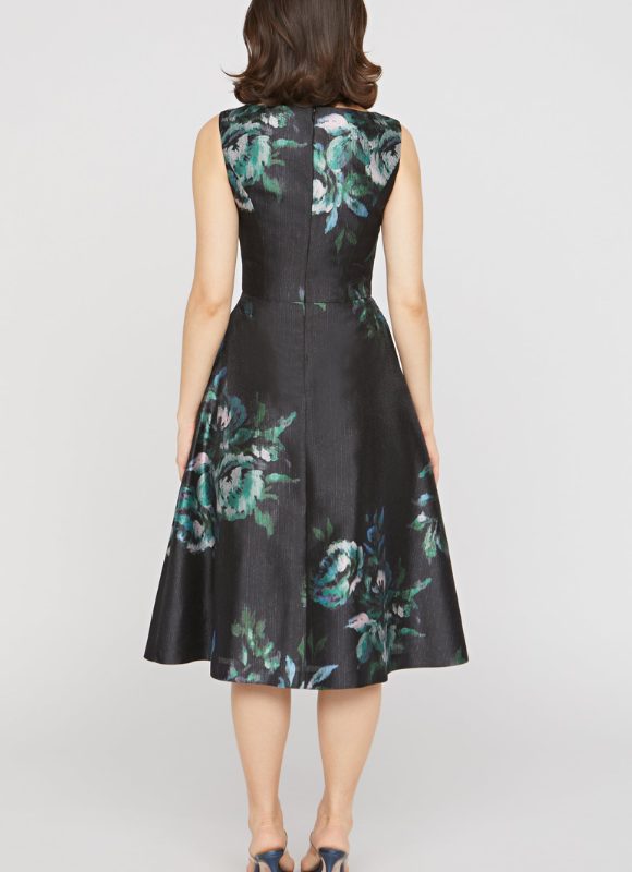 Description: Painted floral print on metallic organza with a subtle sheen and rich texture. Finished with a pleated midi skirt for soft volume and structure. A romantic pick for artful weddings and festive winter soirées.