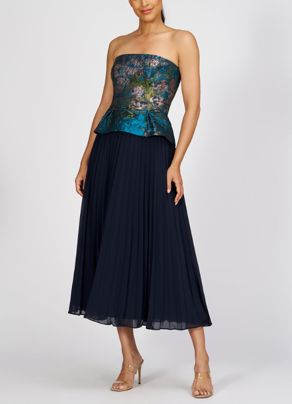 Description: The Giannina Dress is a striking fusion of texture and movement. Featuring a structured strapless bodice in a rich, metallic jacquard, it cinches the waist before flowing into a gracefully pleated chiffon skirt. Elegant and contemporary, this dress is the perfect statement. Strapless with pleated skirt.