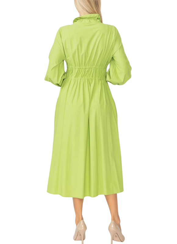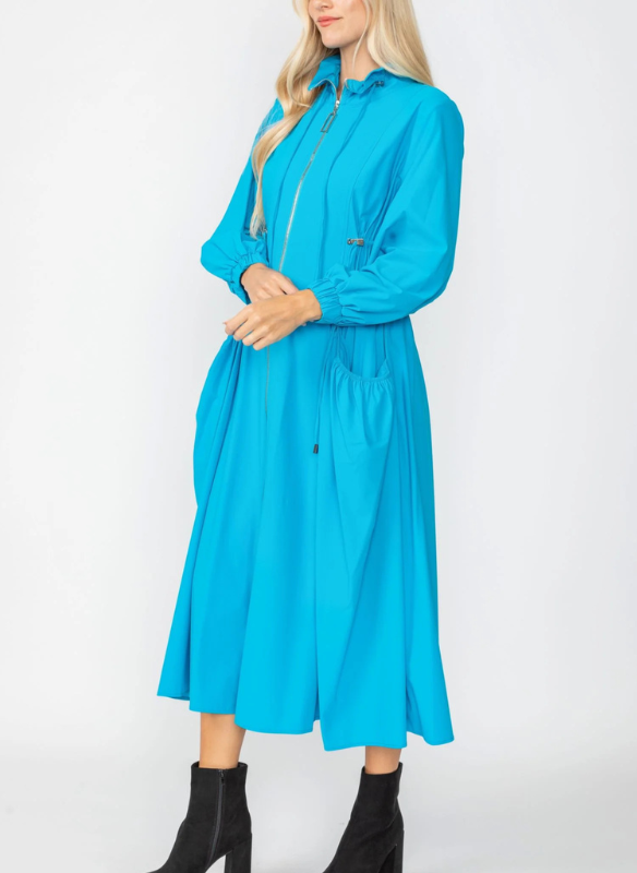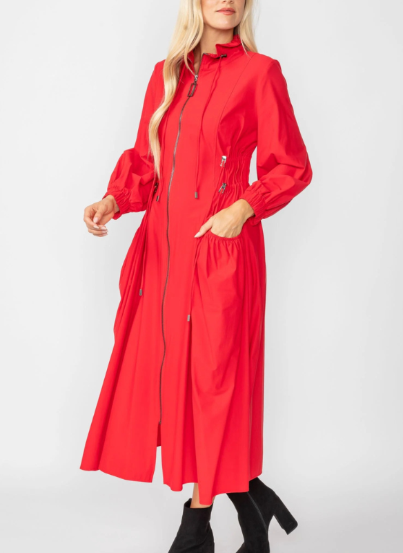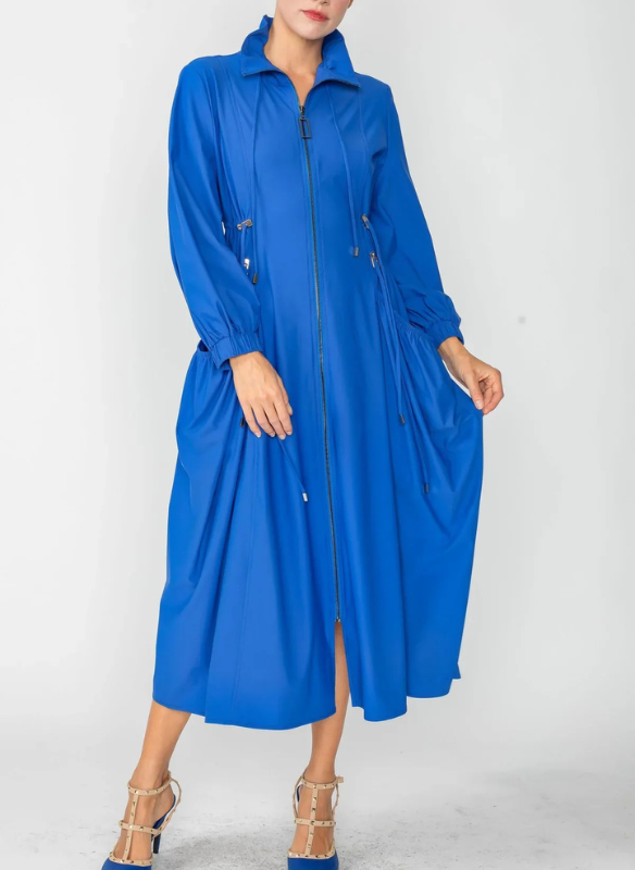 Description: Long sleeved shirring long jacket with stand collar and pockets. Draw string detailing allow for adjusting fit. Can be left open and worn as a jacket or zipped up as a dress. Material: 76% Nylon, 24% Spandex. Produced in a facility that is based in Los Angeles, CA. USA,