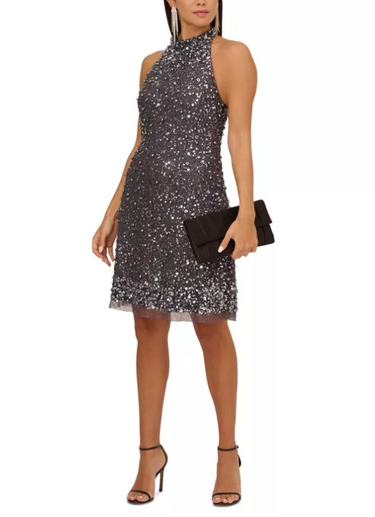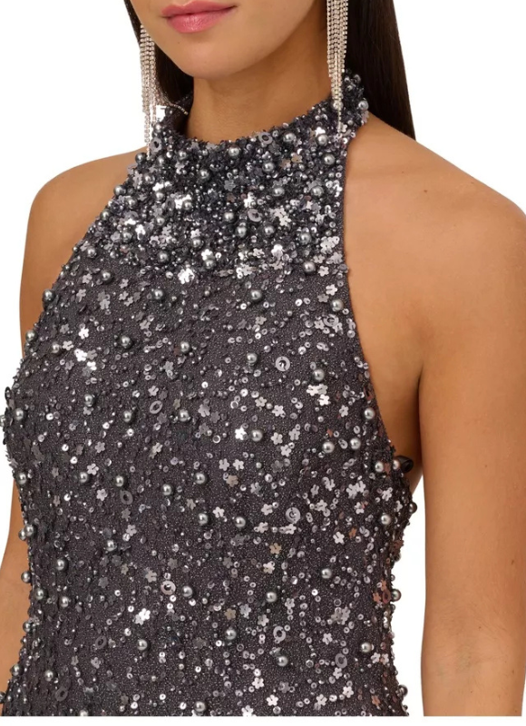 Description: Sleeveless halter above the knee dress. Fit and flare with beading throughout
