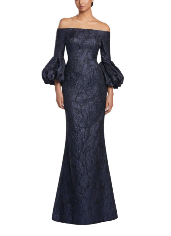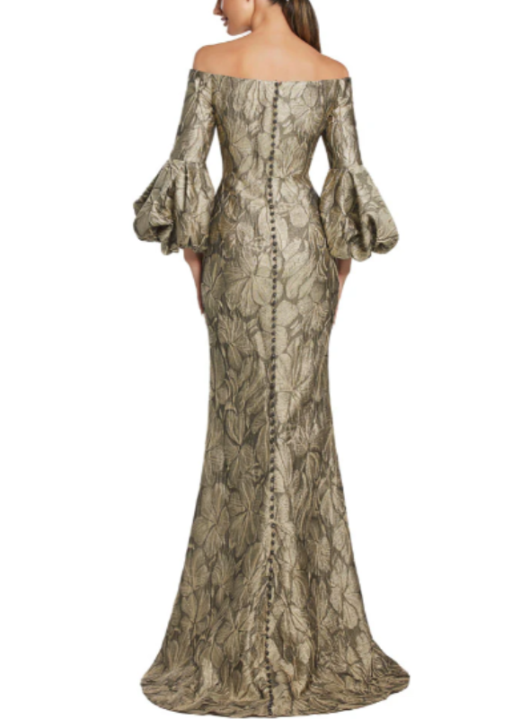 Description: Off the shoulder jacquard gown with puff sleeves and detailed buttons down the back