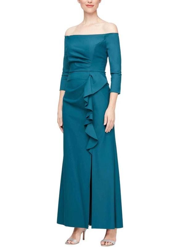 Alex Evenings Long Off the Shoulder Compression Dress With Front Cascade Detail Skirt