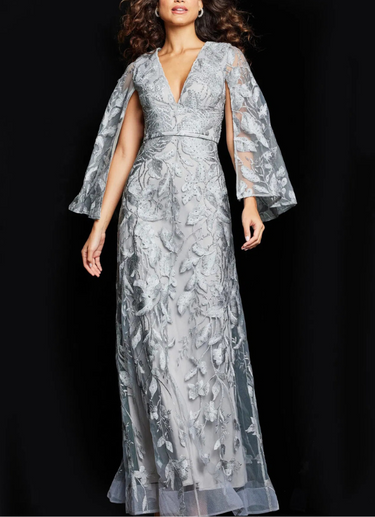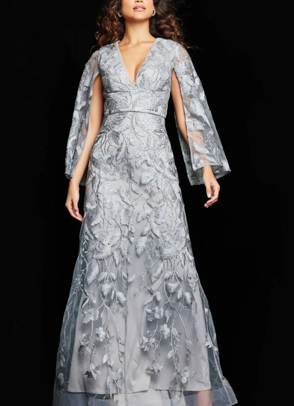 Description: Elegant gown designed for formal occasions, specifically tailored for mothers of the bride. Crafted from embroidered mesh, this dress features an A-line silhouette with exquisite details that add sophistication to its overall design.A-line silhouette of the dress creates a classic and universally flattering look and scattered stones, adding a touch of subtle glamour and sophistication, and sheer sleeves that provide an elegant and ethereal quality to the ensemble. With a floor-length hem, the dress exudes formality and grace, making it suitable for a range of special occasions. The back is closed, maintaining a classic and polished appearance.The neckline is a V-neck, adding a timeless and flattering element to the gown. The three-quarter sleeves with slits add a modern and stylish touch.This gown is a statement piece that seamlessly combines sophistication with meticulous design elements, making it an ideal choice for mothers of the bride seeking an elegant and memorable ensemble for a special day.