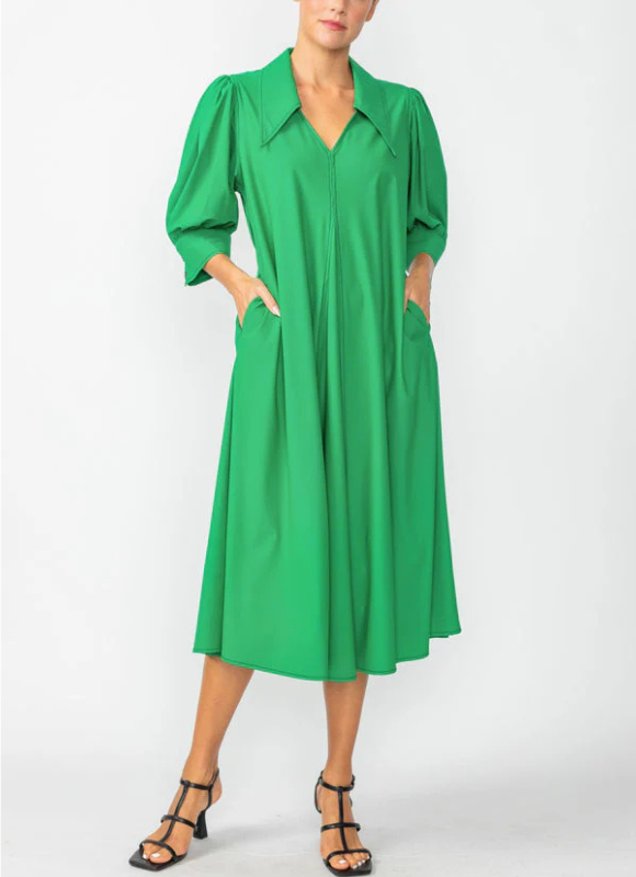 Description:  3/4 sleeve dress in a relaxed silhouette. Made of IC's techno material with a slight stretch. Pointed collar and pockets. Made in the USA