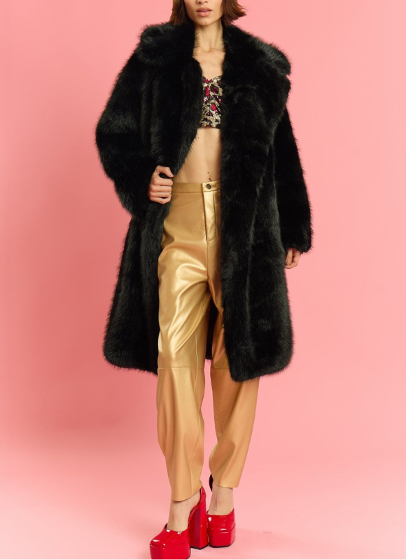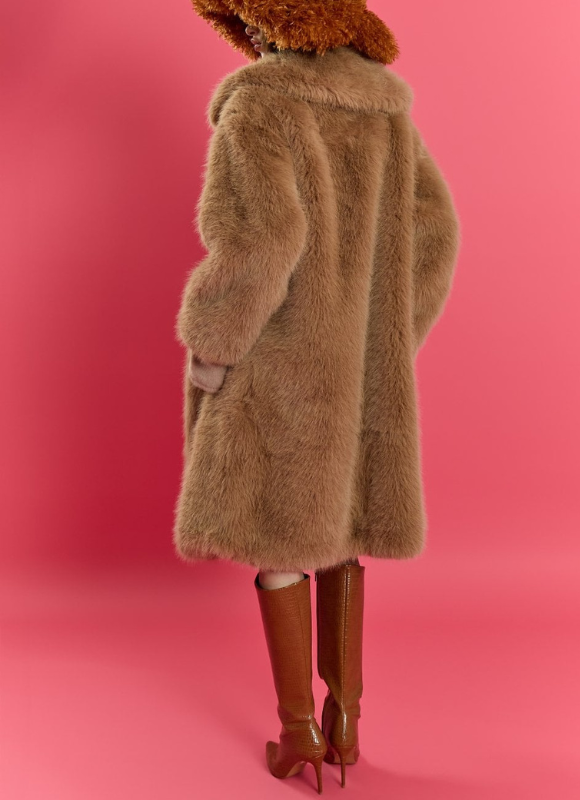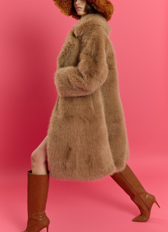 Description: This sustainable bamboo blend luxe faux fur coat is a long midi length, well-made, and designed to last for many years. It features deep pockets, is fully lined, and has long sleeves with a lapel collar. The loose fit makes it versatile for everyday wear across various seasons, suitable for office, festival, or even wedding outfits.