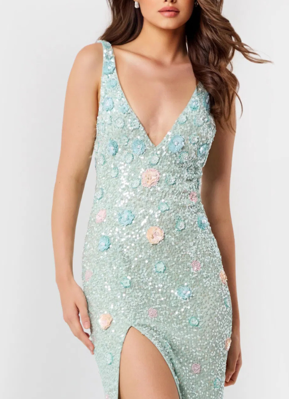 Description: Deep v gown with floral sequin embellishment. Sheath style with high slit