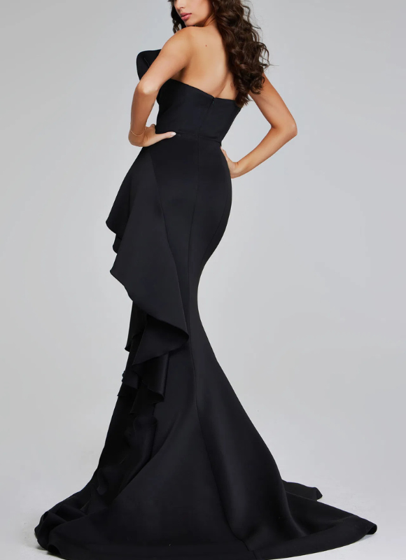 Description: Strapless mermaid gown with exaggerated ruffle. Zip up full back