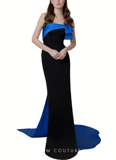 Description: Stunning strapless gown with accented neckline and flowing sash