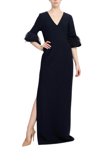 Description: Magnificent long dress with timeless class and contemporary elegance. Crafted from exquisite crepe fabric, the dress features quarter length sleeves with lavish feathered accents, princess seams for extra comfort, a high thigh slit for a touch of daring, and a full length column skirt for a sophisticated silhouette. This piece promises to make a regal statement at any social occasion, ensuring you stand out from the crowd in a look of exquisite luxury.