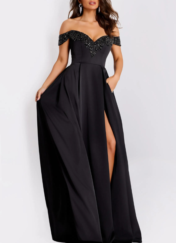 Description: Off the shoulder A-line gown with sweetheart neckline embellished with beads. Pockets and high side slit.