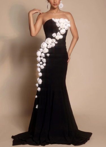 Description: Style PS26305E embodies classic femininity with a modern sculptural twist. The strapless gown features a clean, form-fitting silhouette adorned with cascading 3D floral appliqu?s that trace elegantly from the neckline down one side of the body. Crafted from smooth fabric that hugs the figure before flaring into a graceful train, this design blends sophistication with romantic artistry.