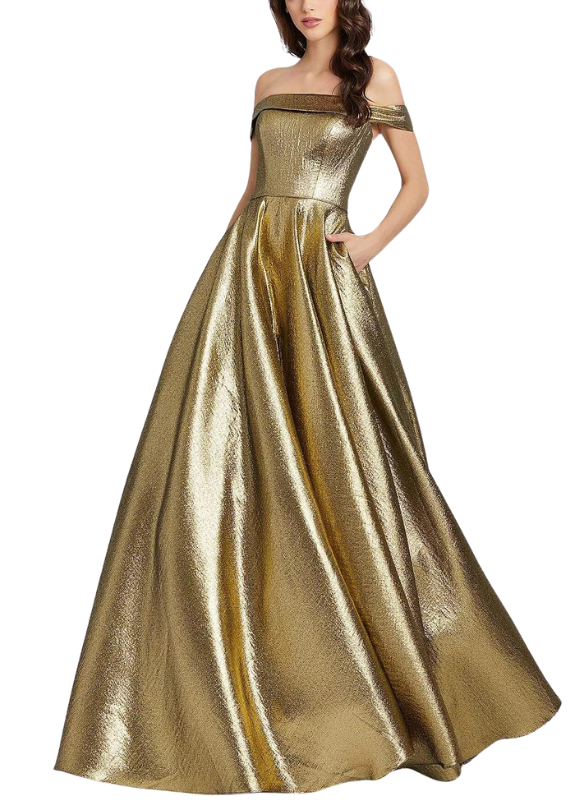 Description: Metallic ball gown with off the shoulder neckline and pockets