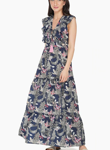 Description: V-neck floral print maxi dress with elasticated waist, ruffles around the neck and hem and tie-up detail at neck