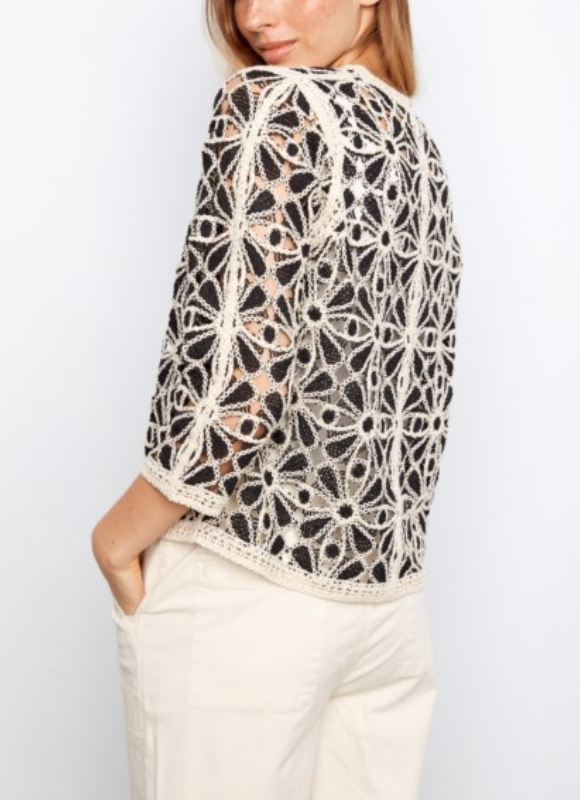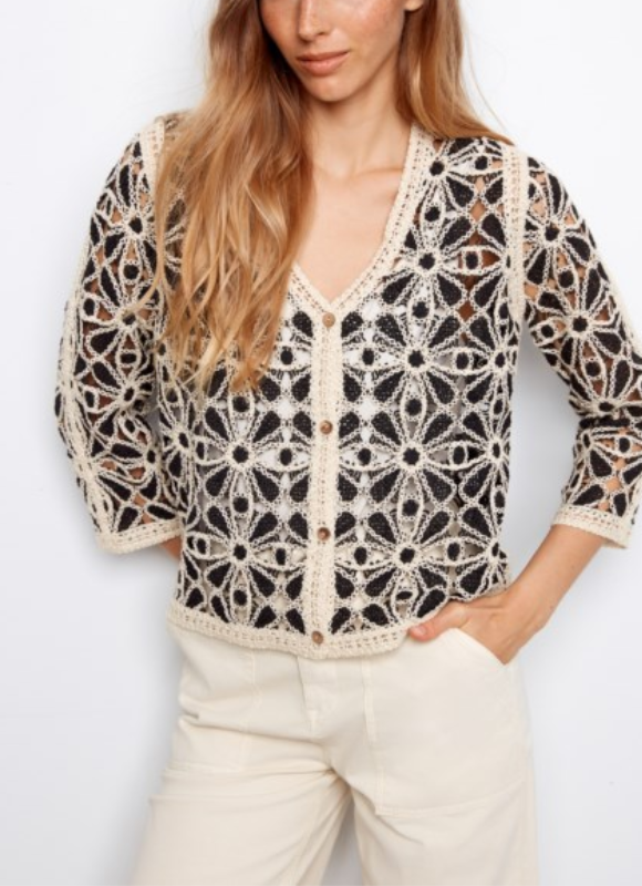 Description: A delicate, crochet-style cardigan with an open-mesh weave in a soft cream and black that provides texture without weight.