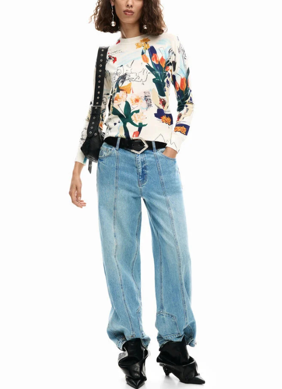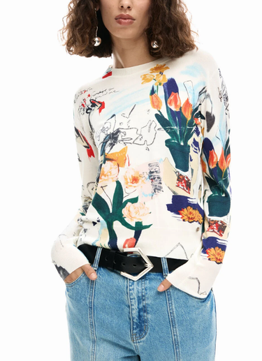 Description: Fine knit jersey with a regular fit featuring a collage-style print and ribbed details on sleeves and cuffs.