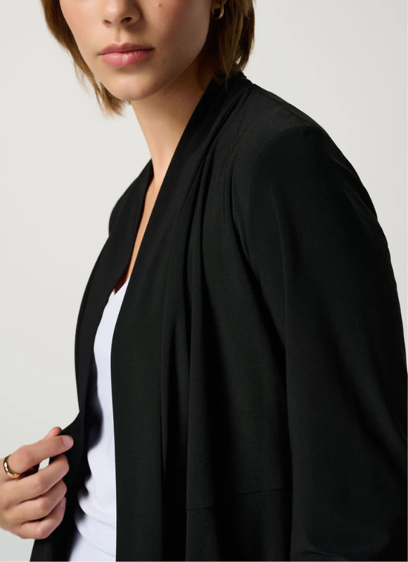 Description: Shawl collar with folded neckband. Open-front closure. Three-quarter bell sleeves. Unlined. Who knew an overpiece could be so glamourous? Step into unwavering style and grace in this silky knit overpiece. The delicate folded neckband, three-quarter sleeves, and flared hem give this luxurious layering piece a certain "je-ne-sais-quoi".