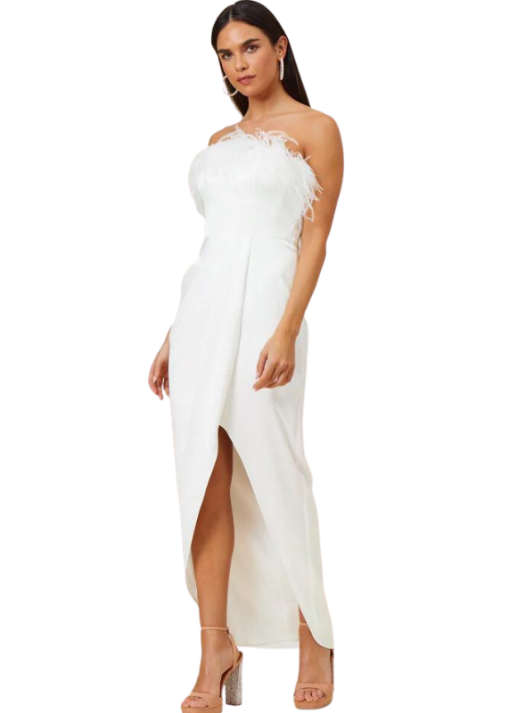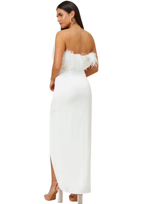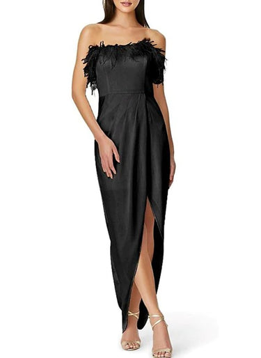 Aidan Mattox Strapless Feather Trim Faux Wrap Satin Dress