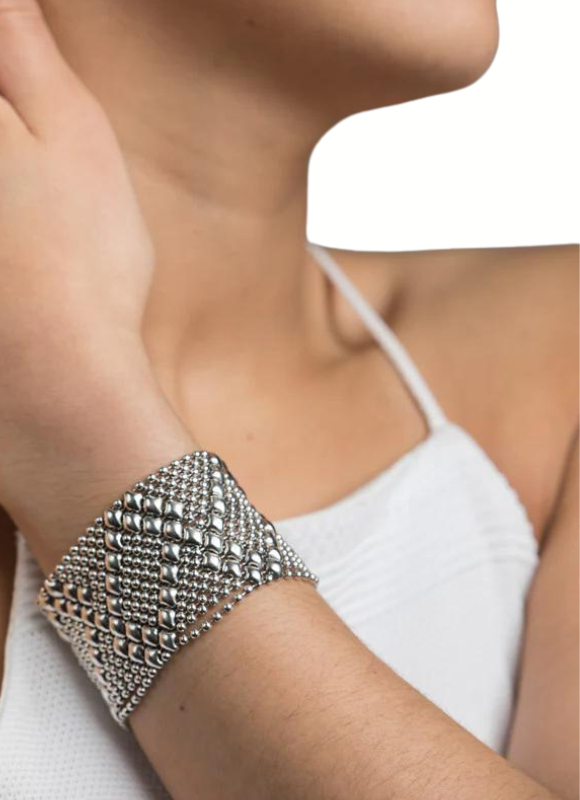 Description: Chrome bracelet from the SG Liquid Metal classic collection by Sergio Gutierrez. Sergio's jewelry can be worn daily. Comfortable silky mesh design. Handmade. Standard size: 7.5" x 1.5"