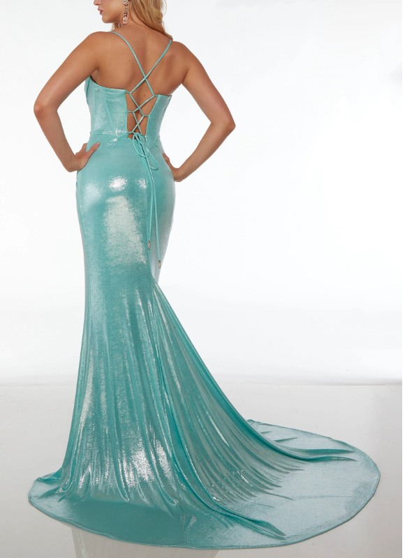 Description: A dress crafted with dazzling glitter fabric. A scoop neckline with cowl detail, spaghetti straps that form into an eye-catching lace-up back for a snug and comfortable fit. The skirt is completed with a sexy side slit and eye-catching train!