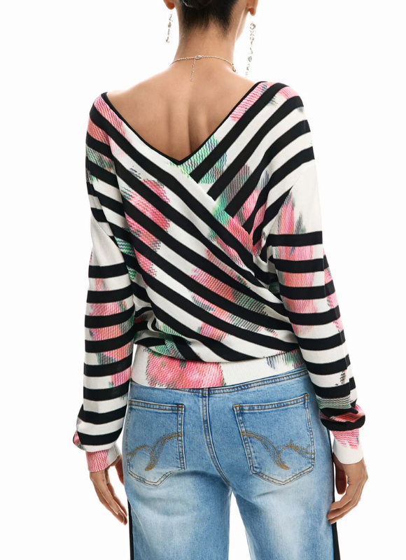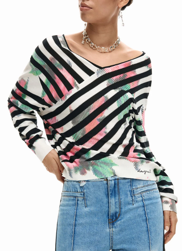 Description: Fine-knit sweater with wrap neckline, striped print over a blurred floral print, and engraved Desigual logo at the hem.