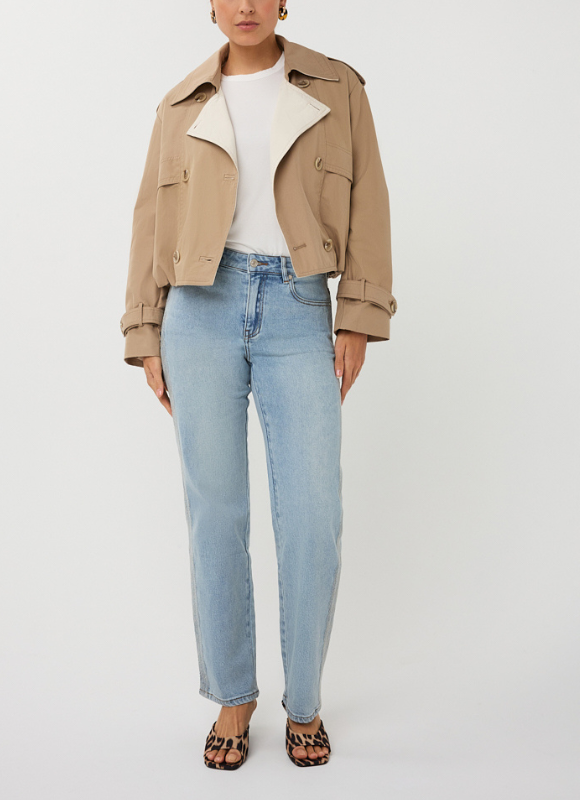 Description: The jacket features a classic double-breasted front with tortoiseshell-style buttons, a wide notched lapel, and structured epaulettes at the shoulders.