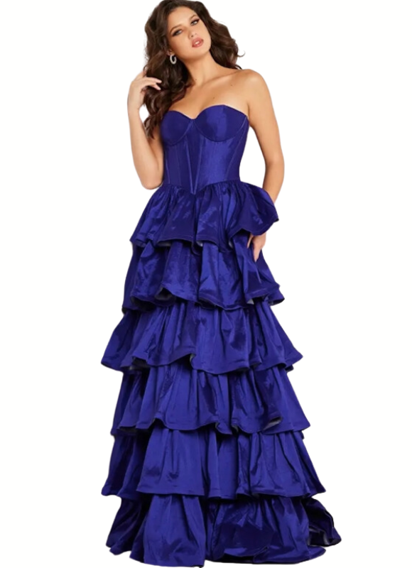 Description: Made of luxe taffeta. Flattering A-line style perfect for prom or any special occasion. Layered skirt and corset bodice with a straight across back style. Features a sweetheart neckline