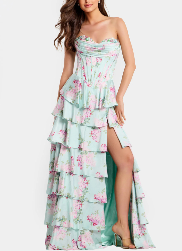 Description: Strapless corset floral print gown with tiered skirt and side slit.