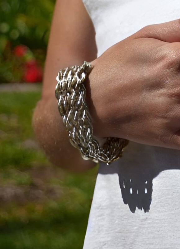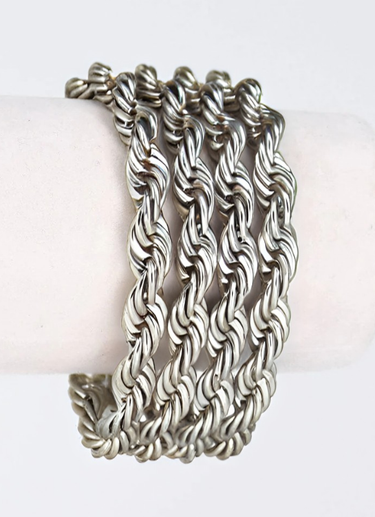 Description: Four rows of shimmering rope chains comprise this beautiful bracelet, center set on an elongated oval link cable chain in antique silver finish. The diamond-cut detail throughout adds extra shine and texture to the bracelet, making these gorgeous chains stand out. Rope chains are the most classic of chains, known for their durability and dimension. PRODUCT DETAILS:Materials: Pewter casting/ Sterling silver plating Measurements: 7" length; 1" width + 1" ext. Closure: Lobster clasp.