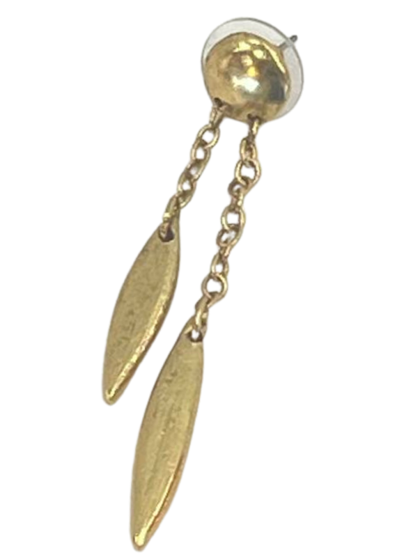Description: Gold-plated drop earrings anchored by a hammered disc stud, showcasing a flattened spear-like charm that dangles from delicate chains.