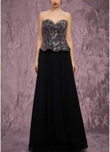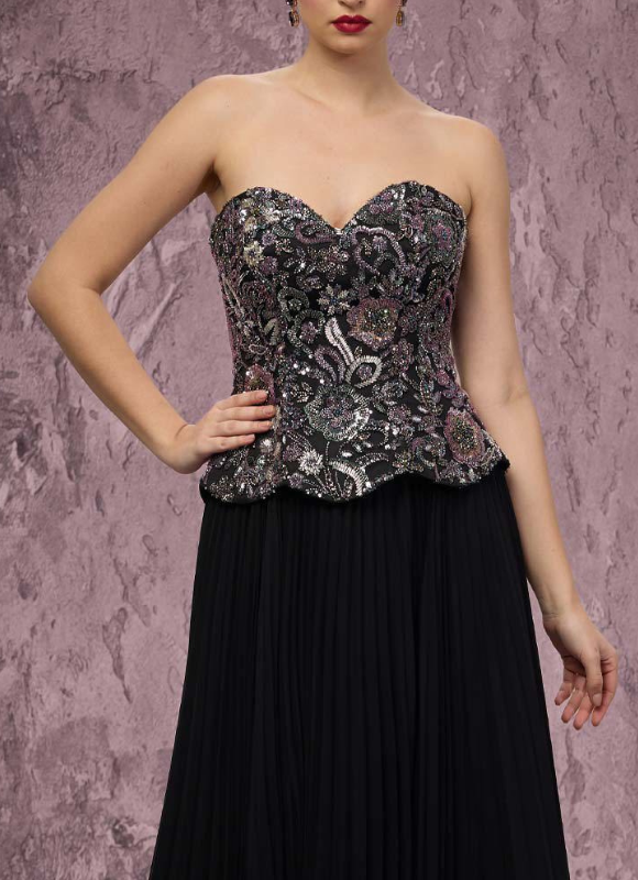 Description: MNM Couture Q7778 Step into a world of elegance and artistry with the Embroidered Dreams in Hollywood collection, where every stitch tells a story.This stunning pleated chiffon gown features a fitted bodice adorned with shimmering, delicate beadwork to accentuate the figure. Shimmering beads add refined sparkle and elegance to the strapless, zippered corset, enhancing the design and perfectly accompanying the soft, structured pleated chiffon floor-length skirt, creating a red-carpet show stopping moment.