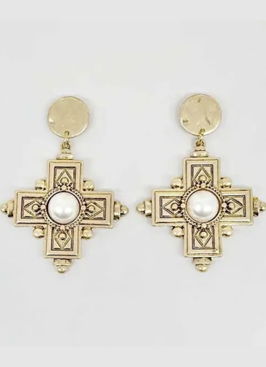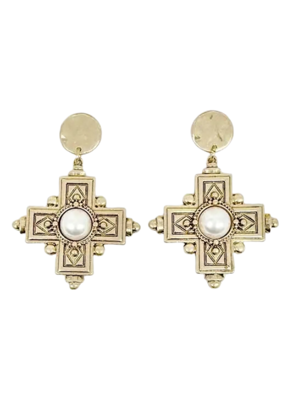 Pretty Persuasions Faux Pearl Adorned Vintage Cross Dangle Earrings