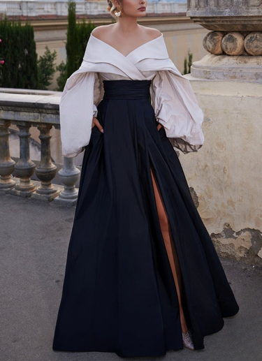 Description: Make an unforgettable entrance in the 261E6720 Mock Two-Piece Evening Gown, a dramatic design that combines modern edge with timeless sophistication. Crafted in lustrous taffeta, this gown features a striking off-the-shoulder neckline paired with voluminous puff long sleeves for a regal statement. The fitted bodice gives the illusion of a two-piece design, flowing into a full-length skirt with a daring slit that adds movement and allure. Designed with a secure center back zipper and hook-and-eye closure, it ensures both comfort and structure throughout the night. The contrasting beige and black palette creates a bold fashion-forward look, making this gown a standout choice for galas, red-carpet events, or high-profile celebrations. Radiating elegance and couture artistry, it captures the refined drama that defines Terani Couture.